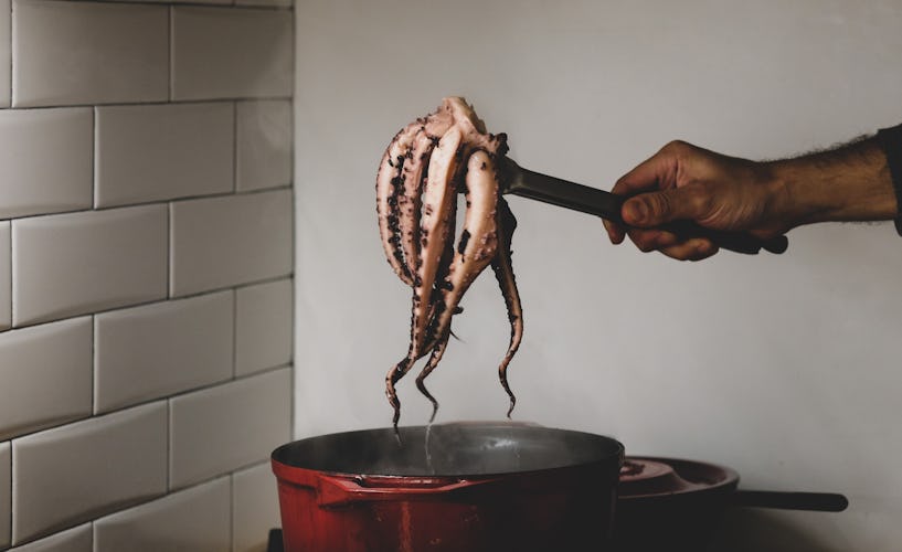Put the octopus in a large pot in a mixture of water and a little vinegar and cook for about 50 to 60 minutes. Do not salt the water and be careful not to overcook it by checking the consistency of the octopus every ten minutes. When the octopus is cooked, rinse the octopus with cold water and cut the tentacles and the head into rings. Mix the chopped octopus with chopped onion and garlic, and season it to your taste. Additionally, you can add capers, olives and olive oil to enrich the salad even more.